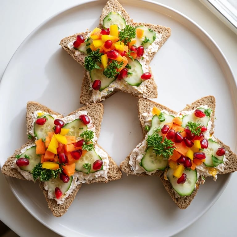 Merken Festliche und spaßige Sandwiches gefüllt mit buntem Gemüse und cremigem Käse, ausgeschnitten in Sternformen – perfekt für Partys oder Kindersnacks.