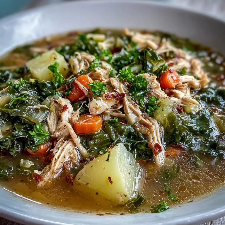 Merken There's something about a bowl of chicken and collard greens soup that feels like a warm conversation—the kind where someone actually listens. I discovered this particular combination on a chilly afternoon when I had half a bunch of collard greens going soft in the crisper drawer and a vague craving for something substantial. The soup came together almost by accident, but once that first spoonful hit, with the tender chicken and those earthy greens swimming in a golden broth, I understood why people keep coming back to soups like this.