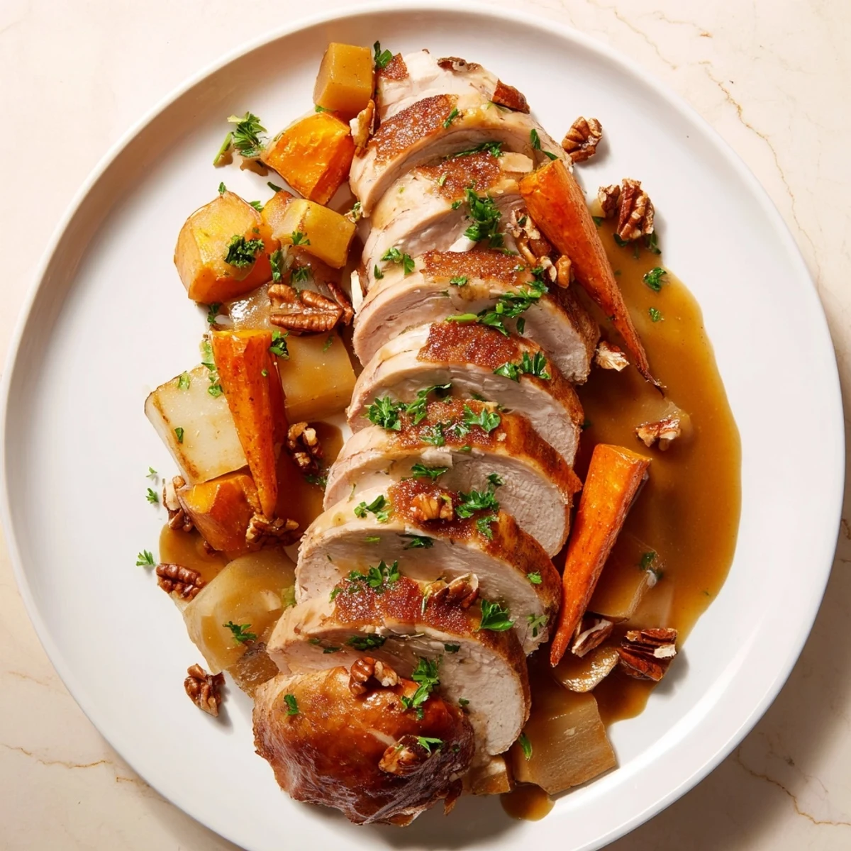 - Nimm deinen schönsten Servierteller. Arrangiere die Truthahnscheiben und Gemüsestücke in überlappenden, kettenartigen Reihen oder Ringen, als würdest du ein visuelles Märchen erzählen. Jede Gemüsereihe ist ein Glied, das die nächste mit sich zieht. Gieße die warme Soße großzügig über alles. Streue die gehackte Petersilie und die Pekannüsse darüber, als würdest du Schnee auf eine Winterszene streuen.