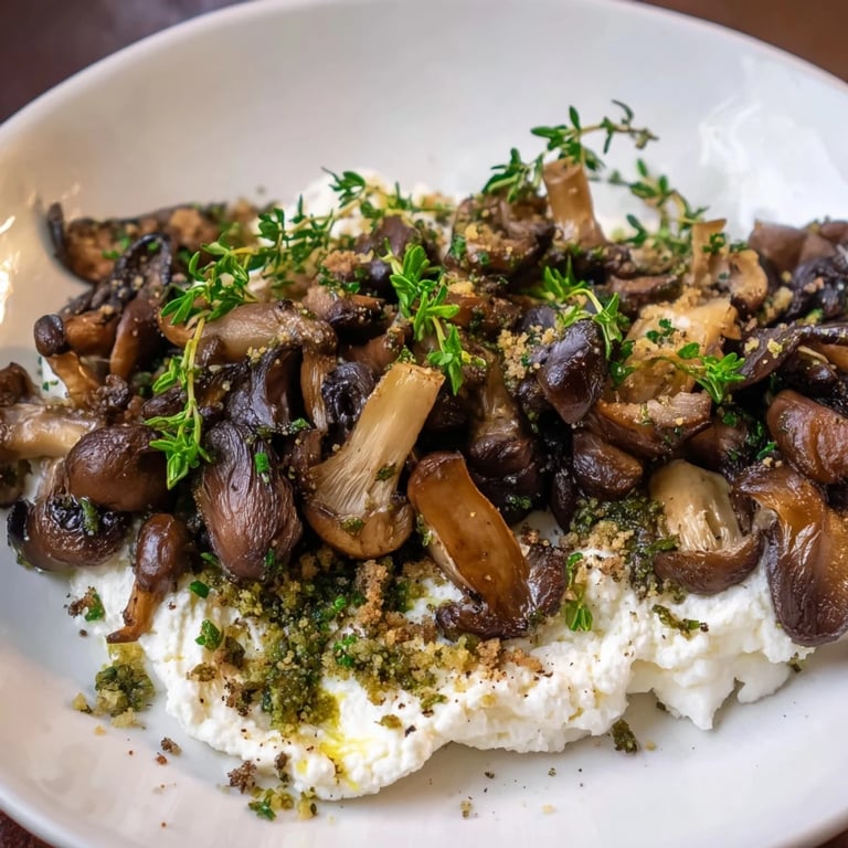 • Pilze: 300 g gemischte Waldpilze (Shiitake, Cremini, Austernpilze), 2 EL Olivenöl, 1 EL ungesalzene Butter, 2 Knoblauchzehen, gehackt, 1 TL frische Thymianblätter, Salz und Pfeffer nach Geschmack