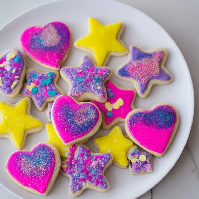 Merken Whimsische, buttrige Zuckerplätzchen in Herz- und Sternform, dekoriert mit funkelndem Royal Icing – perfekt für eine magische Teeparty oder eine royale Feier.
