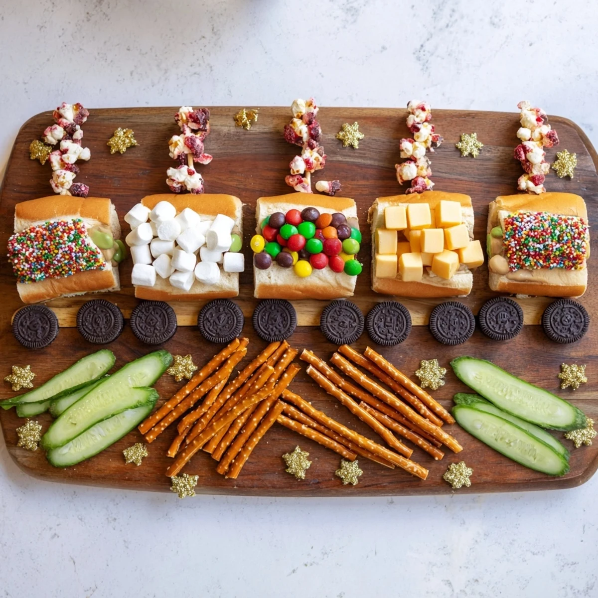 Merken Ein verspieltes, von den Feiertagen inspiriertes Snack-Board mit süßen und herzhaften Leckereien, die so arrangiert sind, dass sie eine magische Reise mit dem Polar Express Zug darstellen. Perfekt für festliche Treffen und Familien-Filmabende.