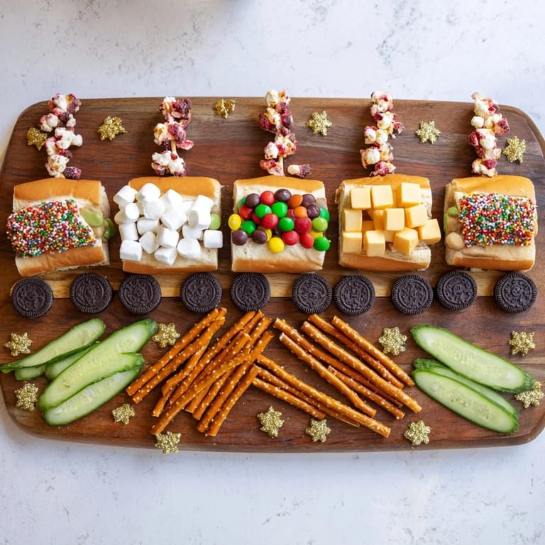 Die Mini-Sandwichbrötchen bilden die Waggons, Schokoladenwaffeln dienen als Räder, und Mini-Brezelstäbchen oder Babykarotten fungieren als Schienen.
