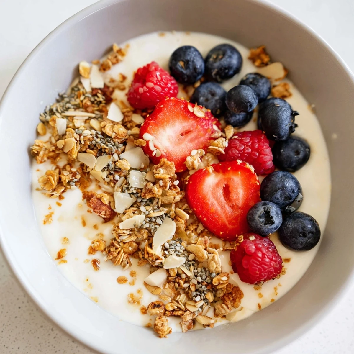 Swap the berries for sliced peach or pear when those are in season, or add a few banana slices if you want something creamier. If you're vegan, plant-based yogurt and vegan protein powder work exactly the same way. The core idea—creamy base, crunchy topping, fresh fruit, a bit of protein—holds up no matter what you do with it.
