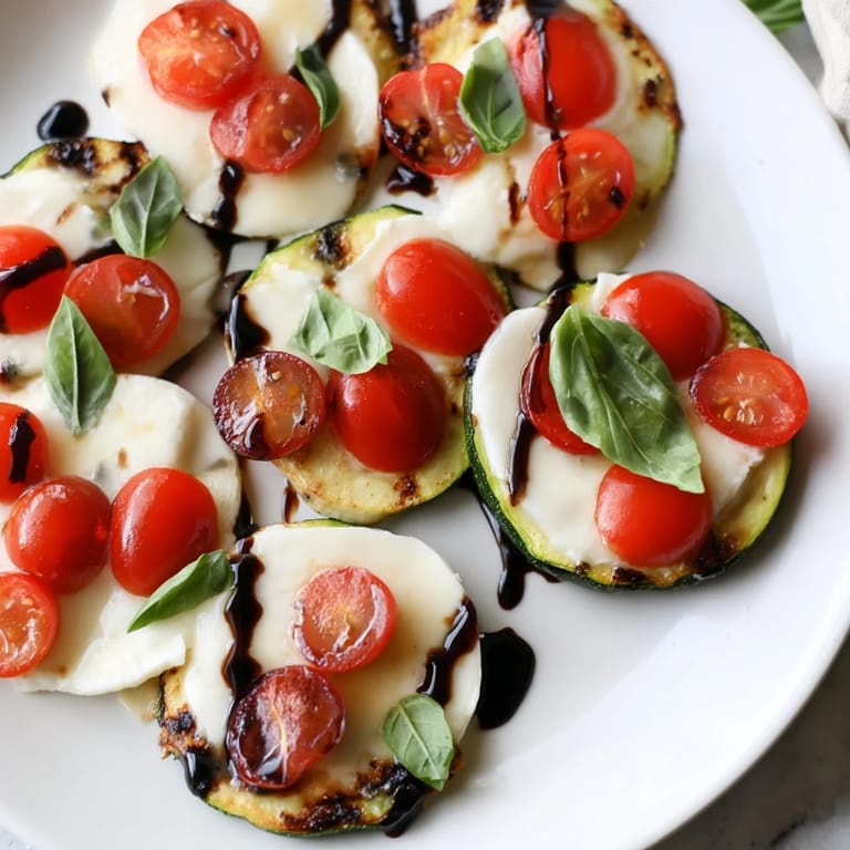 Knackige Zucchini kombiniert mit Mozzarella, Tomaten und Basilikum, verziert mit balsamischer Glasur.