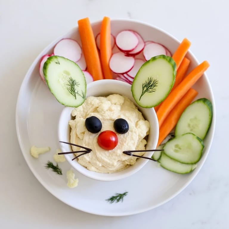 Der Dip bildet den Körper, Blumenkohl formt den Kopf, Gurkenscheiben und Karottenstäbchen dienen als Ohren, schwarze Oliven als Augen und Nase.