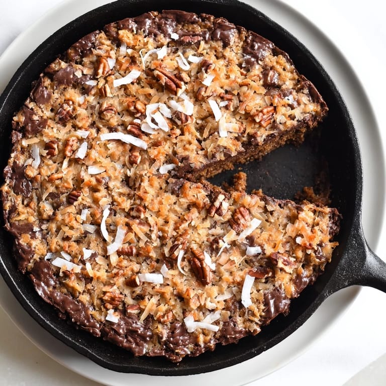 Merken Ein reichhaltiger, klebriger Pfannkuchen inspiriert vom klassischen German Chocolate Cake, mit einem Schokoladenchip-Boden und einer köstlichen Kokos-Pekan-Schicht. Perfekt zum Teilen direkt aus der Pfanne!