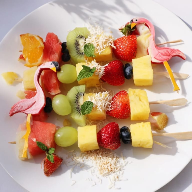 Diese frischen, farbenfrohen Spieße kombinieren tropische Früchte wie Ananas, Mango, Kiwi und Wassermelone. Die Stücke werden abwechslungsreich auf Flamingo-Spieße gesteckt und dekorativ angerichtet. Ein Hauch von Kokosflocken und Minze sorgt für eine interessante Geschmacksnote. Ideal für sommerliche Partys oder leichte Snacks, flexibel vorzubereiten und servierfertig in kurzer Zeit.