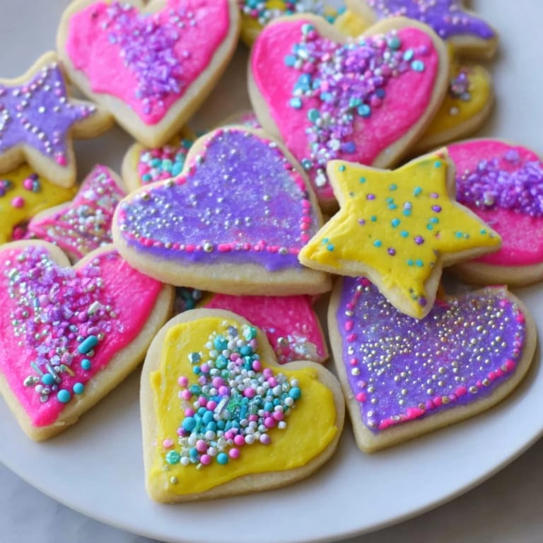 Merken Whimsische, buttrige Zuckerplätzchen in Herz- und Sternform, dekoriert mit funkelndem Royal Icing – perfekt für eine magische Teeparty oder eine royale Feier.